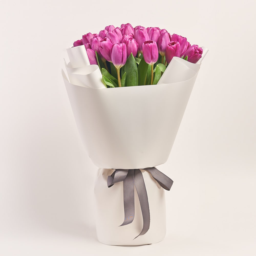 Charming bouquet of bright purple tulips in an elegant white package with a delicate gray ribbon.